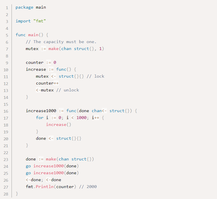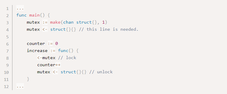 В одном из приведенных выше примеров упоминалось, что буферизованные каналы с одной емкостью можно использовать в качестве одноразового двоичного семафора. Такие каналы также можно использовать как многократные двоичные семафоры, известные как мьютексы, хотя эти мьютексы не так эффективны, как мьютексы, предоставляемые в sync стандартном пакете.