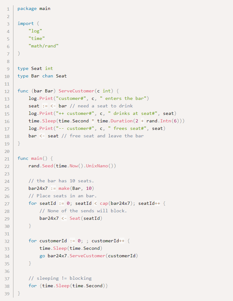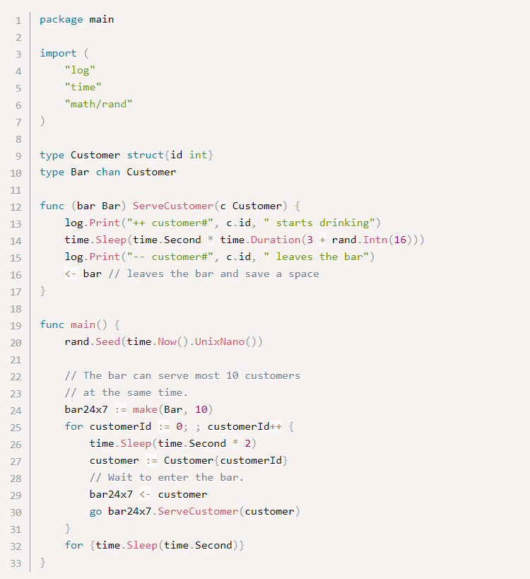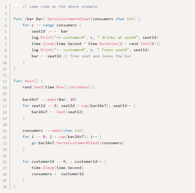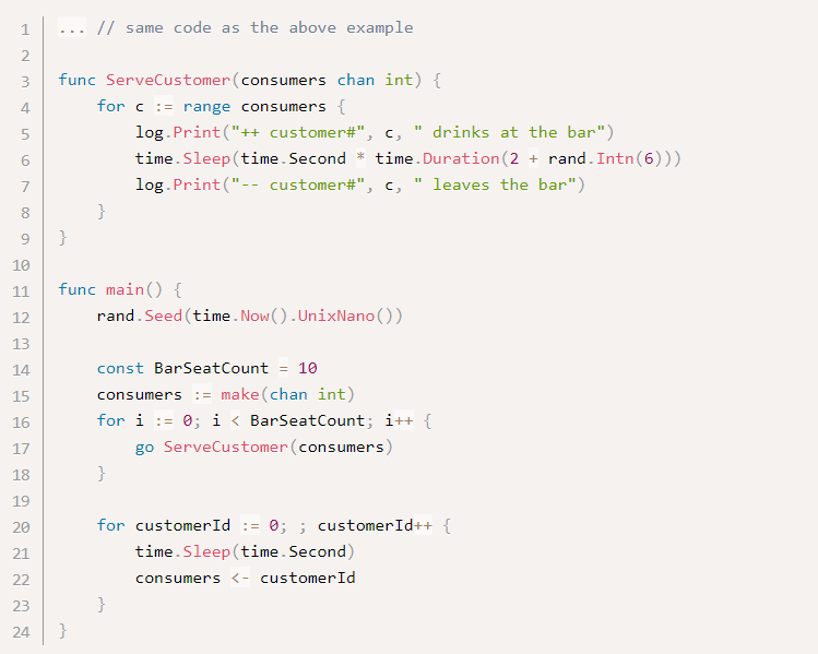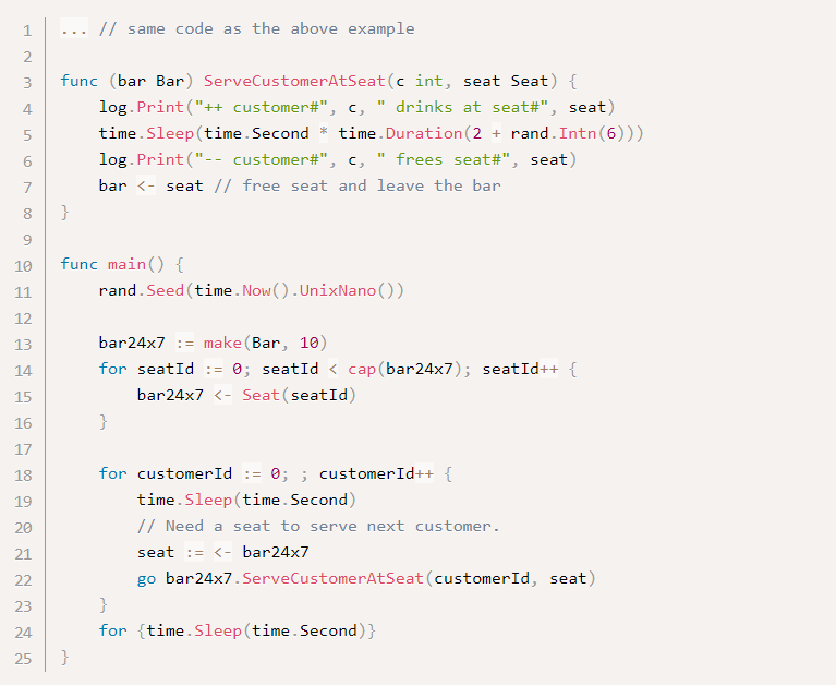В приведенном выше примере несмотря на то, что в любой момент времени будет больше десяти клиентов, которые пьют, в баре может одновременно обслуживаться более десяти клиентов. Некоторые клиенты ждут свободных мест. Хотя каждая клиентская горутина потребляет гораздо меньше ресурсов, чем системный поток, общими ресурсами, потребляемыми большим количеством горутин, нельзя пренебречь. Поэтому лучше создавать клиентскую горутину, только если есть свободное место.
