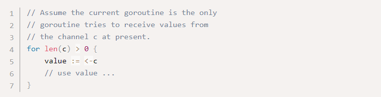 Однако есть несколько сценариев, в которых нам нужно использовать две функции. Например, иногда мы хотим получить все значения, буферизованные в незакрытом канале c, в который больше никто не будет отправлять значения. Тогда мы можем использовать следующий код для получения оставшихся значений.