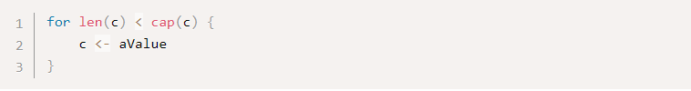 Иногда горутина может захотеть записать некоторые значения в буферизованный канал c, пока он не заполнится, не входя в состояние блокировки в конце, и горутина является единственным отправителем канала, тогда мы можем использовать следующий код для выполнения этой работы.