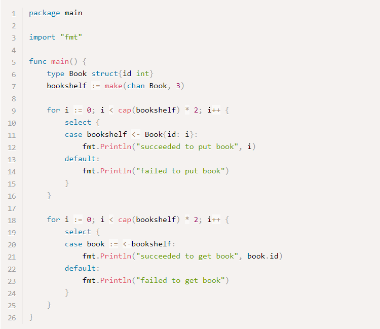 Блок select с одной default ветвью и только с одной case ветвью называется операцией канала «попытка-отправка» или «попытка-получить» в зависимости от того, является ли операция канала, следующая за case ключевым словом, операцией отправки или приема канала.