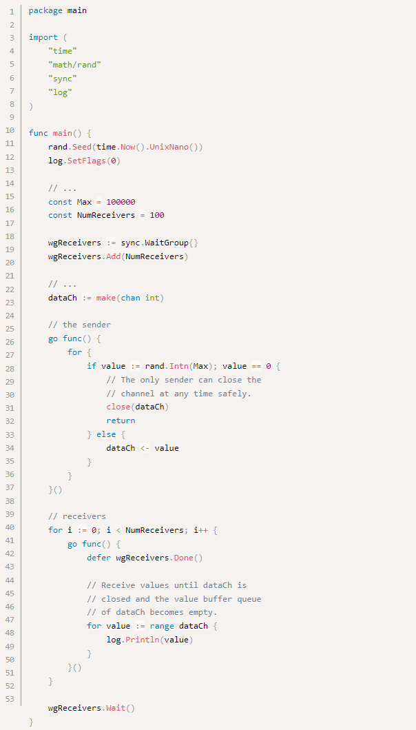 В решениях для описанных выше ситуаций с N-отправителями, чтобы придерживаться принципа закрытия канала, мы избегаем закрытия каналов данных. Однако иногда требуется, чтобы каналы данных были закрыты в конце, чтобы получатели знали, что отправка данных завершена. В таких случаях мы можем преобразовать ситуацию с N отправителями в ситуацию с одним отправителем, используя промежуточный канал. Средний канал имеет только одного отправителя, поэтому мы можем закрыть его вместо закрытия исходного канала данных.