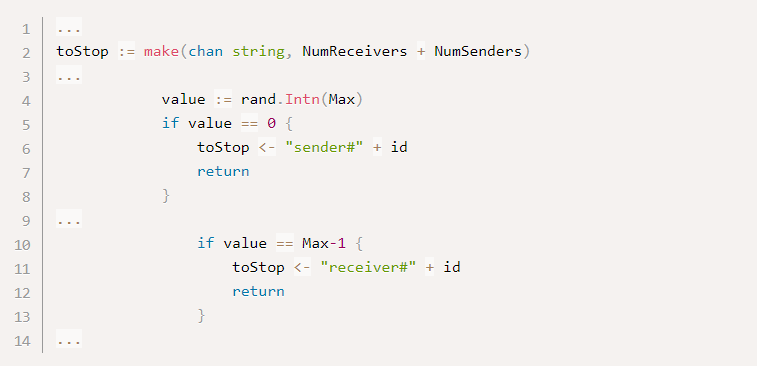 Мы также можем установить пропускную способность toStop канала как сумму отправителей и получателей, тогда нам не нужен блок попытки отправки select для уведомления модератора.