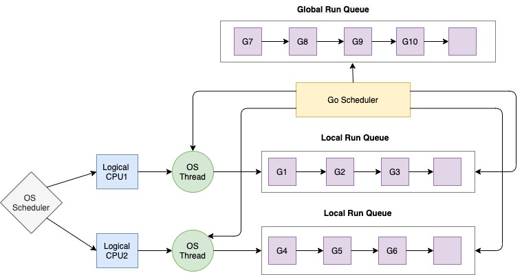 Каждому P присваивается LRQ, который управляет горутинами, назначенными для выполнения в контексте P. Эти горутины по очереди включаются и выключаются в зависимости от контекста M, назначенного этому P. GRQ предназначен для горутин, которые не были назначены для этого P. Существует также процесс перемещения горутин из GRQ в LRQ.