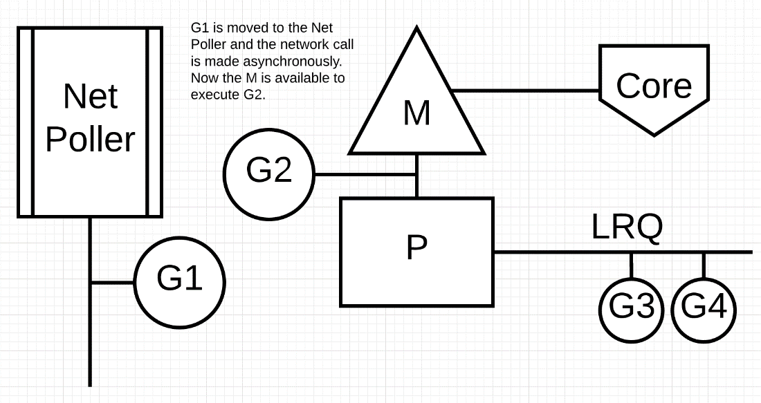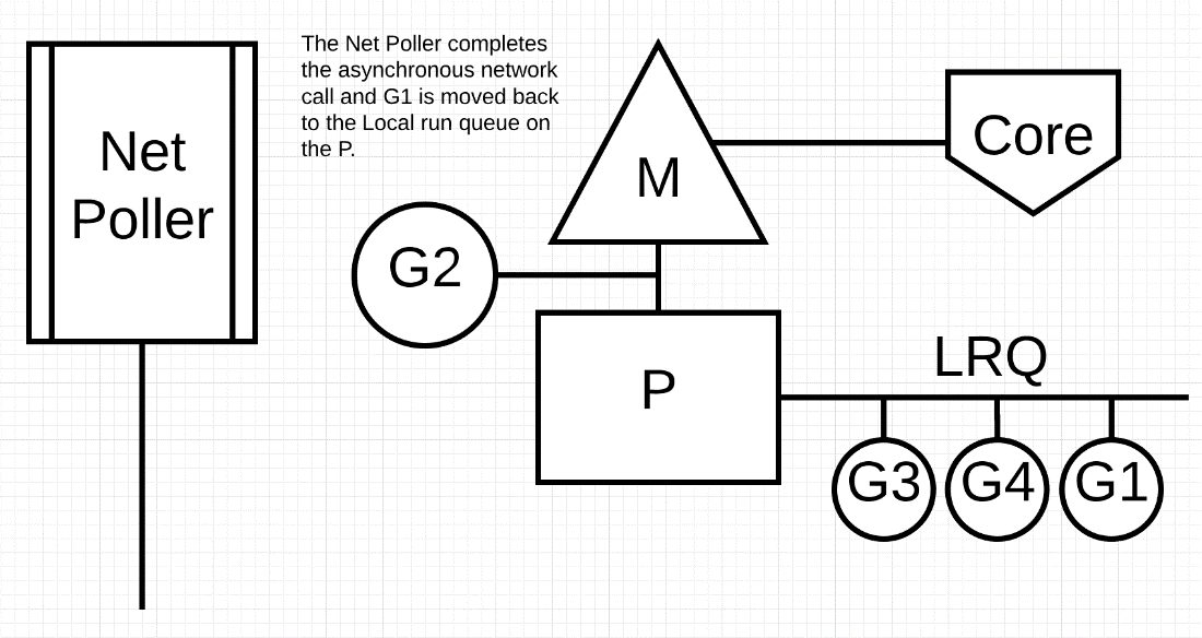 На изображении выше асинхронный сетевой системный вызов завершается сетевым опрашивающим устройством, и горутина-1 перемещается обратно в очередь LRQ для P, где она может выполниться снова. Большим преимуществом здесь является то, что для выполнения сетевых системных вызовов не требуются дополнительные M. Net poller имеет поток ОС и обрабатывается в эффективном цикле обработки событий.