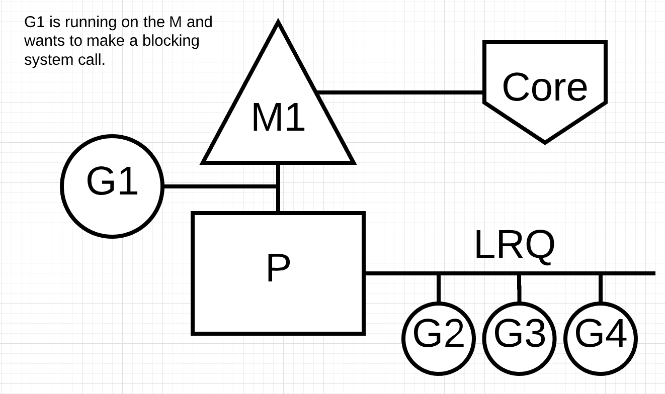 На изображении снова показана наша базовая диаграмма планирования, но на этот раз Горутина-1 собирается сделать синхронный системный вызов, который заблокирует M1.