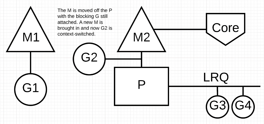 На изображении выше планировщик может определить, что горутина-1 вызвала блокировку M. В этот момент планировщик отсоединяет M1 от P с все еще присоединенной блокирующей горутиной-1. Затем планировщик вводит новый M2 для обслуживания P. В этот момент можно выбрать Goroutine-2 из LRQ и переключить контекст на M2. Если M уже существует из-за предыдущего обмена, этот переход выполняется быстрее, чем создание нового M.