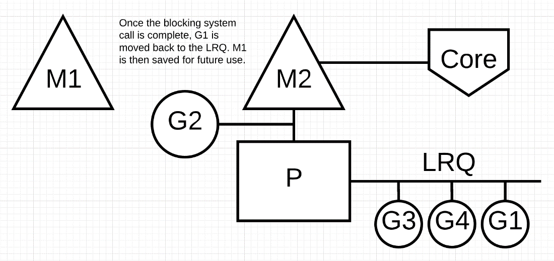 На изображении выше системный вызов блокировки, сделанный Goroutine-1, завершается. В этот момент Goroutine-1 может вернуться в LRQ и снова быть обслуженным P. Затем M1 откладывается в сторону для будущего использования, если этот сценарий должен повториться.