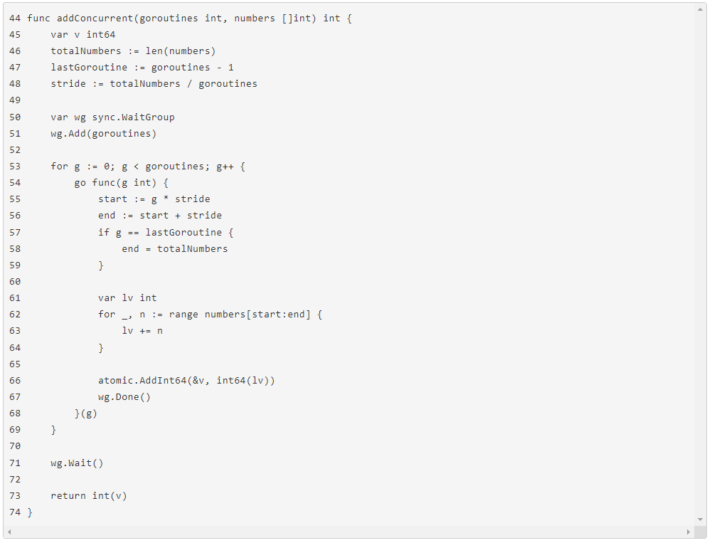В листинге №2 представлена функция addConcurrent, которая является конкурентной версией функции add. Конкурентная версия использует 26 строк кода по сравнению с пятью строками кода для неконкурентной версии. Кода много, поэтому выделим только важные для понимания строки.