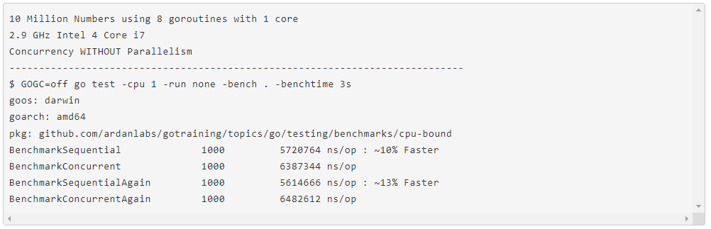 В листинге №3 выше показаны эталонные функции. Вот результаты, когда для всех горутин доступен только один поток ОС/аппаратного обеспечения. Последовательная версия использует одну Горутину, а конкурентная версия использует runtime.NumCPU или восемь Горутин в нашем случае. В этом случае конкурентная версия использует конкурентность без параллелизма.