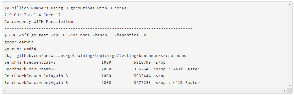 Вот результаты, когда для каждой горутины доступен отдельный поток ОС/оборудования. Последовательная версия использует одну Горутину, а конкурентная версия использует runtime.NumCPU или восемь Горутин на используемой машине. В этом случае конкурентная версия использует конкурентность с параллелизмом.
