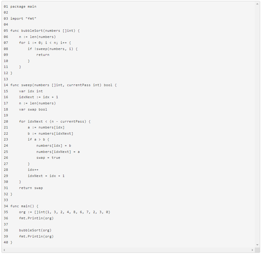 В листинге выше приведен пример пузырьковой сортировки, написанный на Go. Этот алгоритм сортировки просматривает набор целых чисел, меняя значения местами при каждом проходе. В зависимости от порядка списка может потребоваться несколько проходов по коллекции, прежде чем все будет отсортировано.