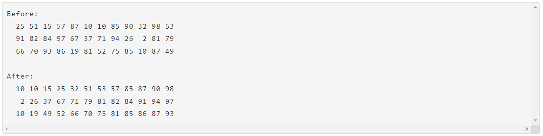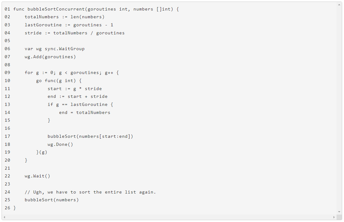 В листинге выше представлена функция bubbleSortConcurrent, которая является конкурентной версией функции bubbleSort. Он использует несколько горутин для одновременной сортировки частей списка. Однако у тебя остается список отсортированных значений по частям. Учитывая список из 36 чисел, разделенных на группы по 12, это будет результирующий список, если весь список не будет отсортирован еще раз в строке 25.