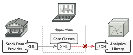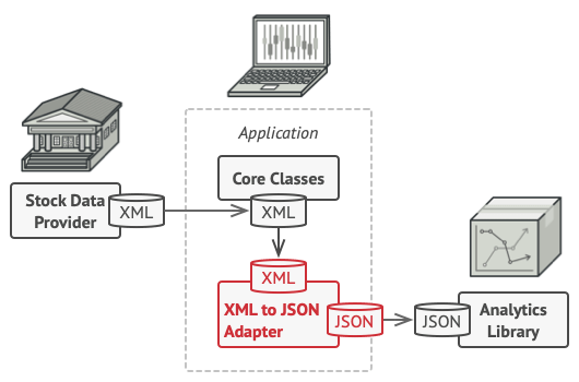 Таким образом, в приложении биржевых котировок мы могли бы создать класс XML_To_JSON_Adapter, который бы оборачивал объект того или иного класса библиотеки аналитики. Наш код посылал бы адаптеру запросы в формате XML, а адаптер сначала транслировал бы входящие данные в формат JSON, а затем передавал бы их методам обёрнутого объекта аналитики.