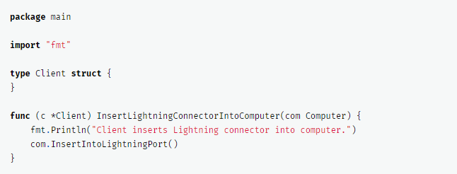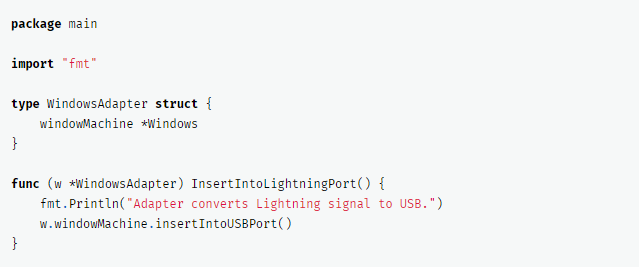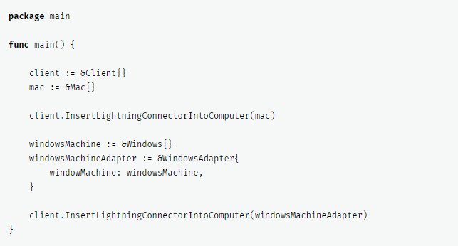Мы имеем код клиента, ожидающий от объекта определенных качеств (порт Lightning). Также у нас есть другой объект под названием Adaptee (ноутбук на Windows), который предоставляет тот же функционал, но через другой интерфейс (USB-порт).