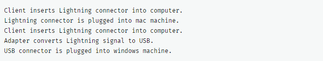 - Переводить запрос от клиента к адаптируемому объекту в форме, которую он ожидает. Адаптер принимает коннектор Lightning, после чего переводит его сигналы в формат USB в ноутбуке на Windows.