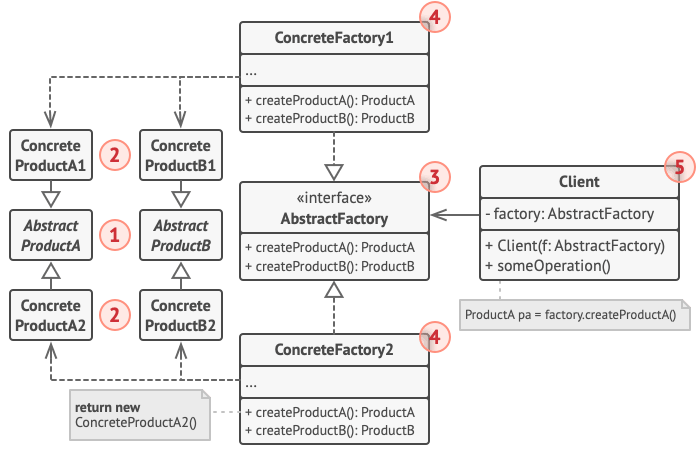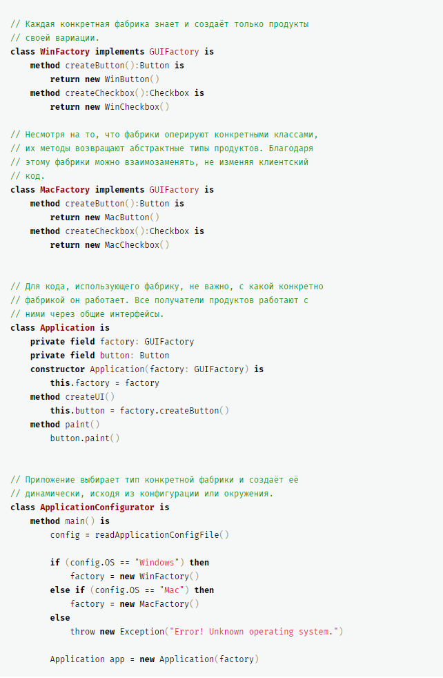 Абстрактная фабрика объявляет список создающих методов, которые клиентский код может использовать для получения тех или иных разновидностей элементов интерфейса. Конкретные фабрики относятся к различным операционным системам и создают элементы, совместимые с этой системой.