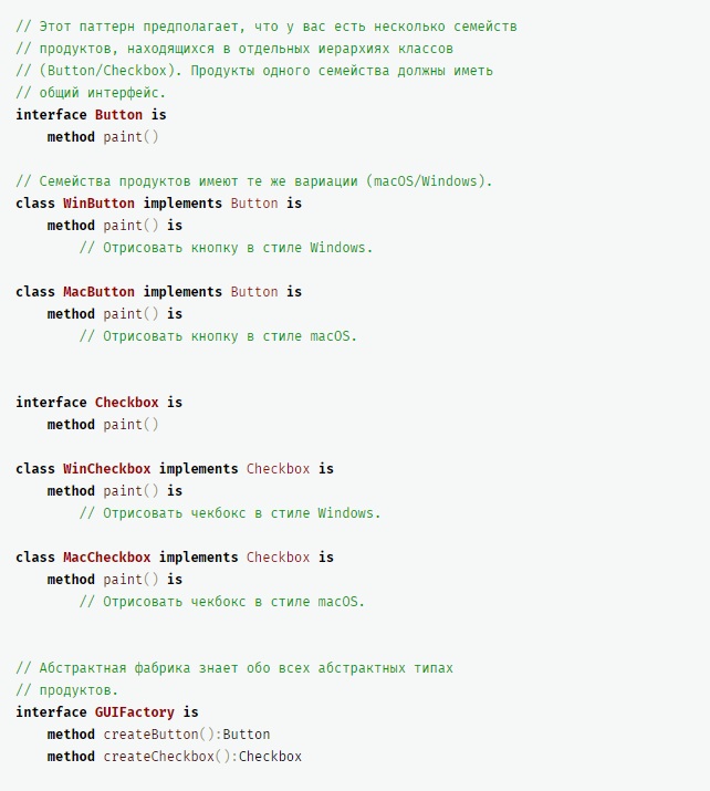 - Несмотря на то что конкретные фабрики порождают конкретные продукты, сигнатуры их методов должны возвращать соответствующие абстрактные продукты. Это позволит клиентскому коду, использующему фабрику, не привязываться к конкретным классам продуктов. Клиент сможет работать с любыми вариациями продуктов через абстрактные интерфейсы.