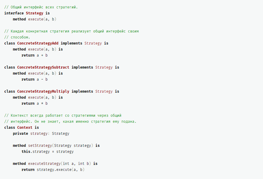 - Стратегия определяет интерфейс, общий для всех вариаций алгоритма. Контекст использует этот интерфейс для вызова алгоритма.