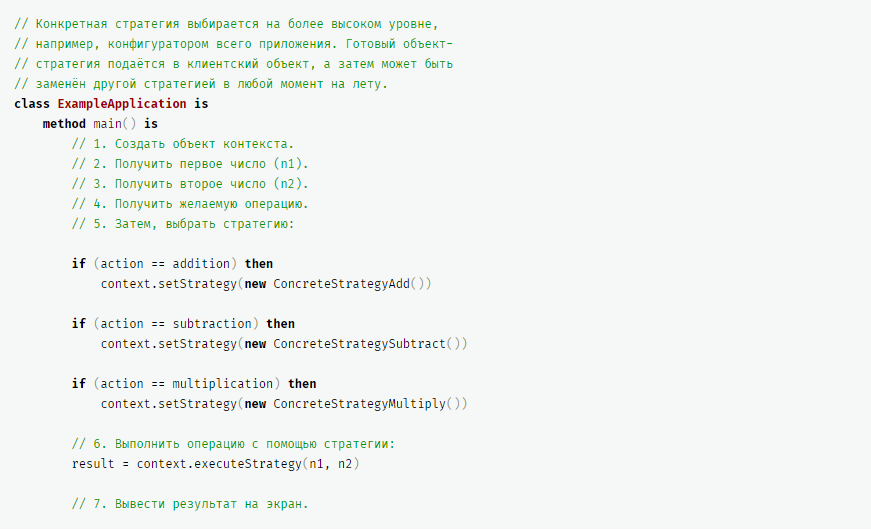 В этом примере контекст использует стратегию для выполнения той или иной арифметической операции.