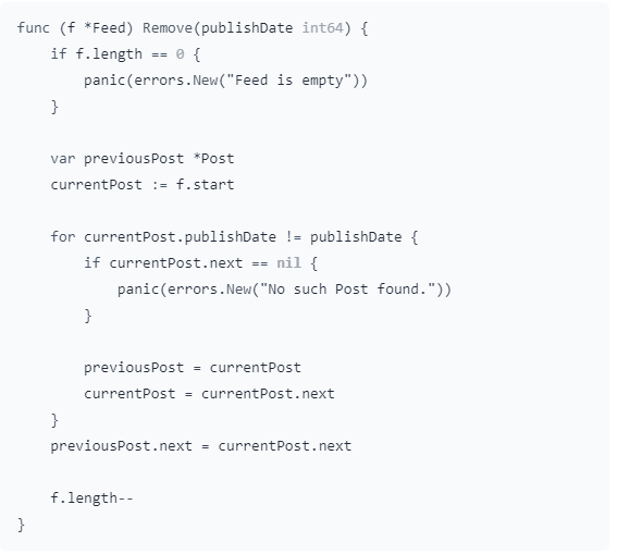 Функция Remove примет publishDate из Post в качестве аргумента, с помощью которого она определит, какой Post нужно удалить (или связь с каким Post нужно отменить). Функция довольно маленькая. Если она обнаружит, что элемент start Feed должен быть удален, то просто переназначит его start Feed второму элементу Post в Feed. В противном случае она перескакивает через каждый из Post’ов в Feed, пока не наткнется на Post, который соответствует тому publishDate, который был передан в качестве аргумента функции. Когда функция найдет и удалит нужный Post, она просто соединит предыдущий и следующий Post’ы.