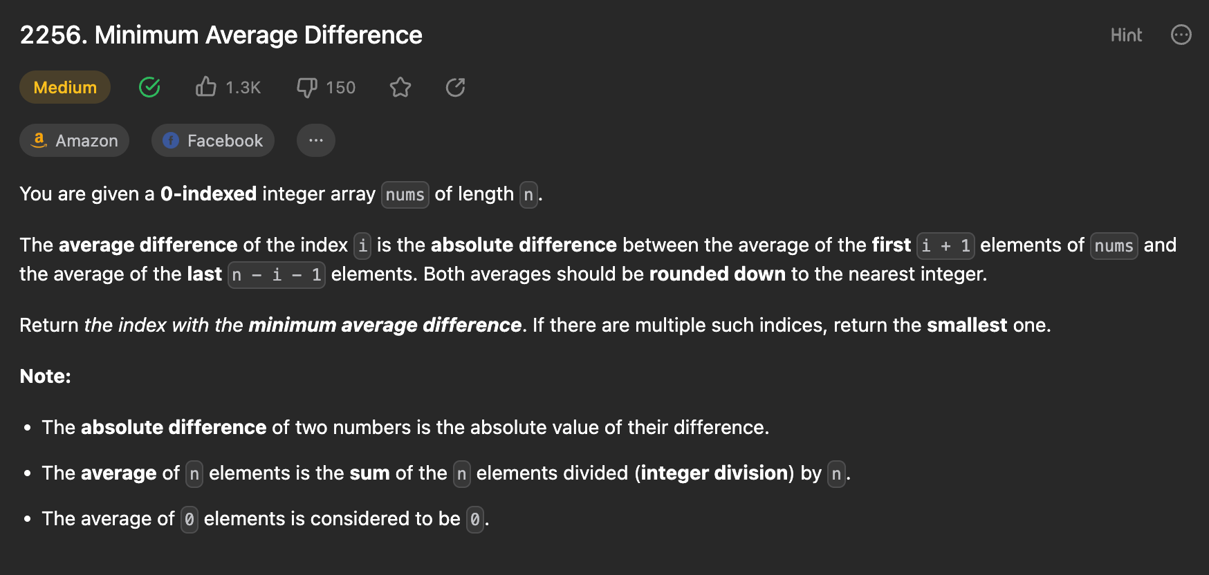 Задача называется minimum average difference, или минимальная средняя разница. Найти ее ты можешь по ссылке. Такую задачу дают на собеседованиях в Amazon и Facebook.