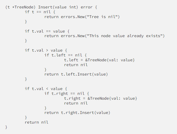 Это довольно просто: мы постоянно сравниваем значение вставляемого узла с узлами в двоичном дереве. Если значение вставляемых данных меньше, чем сравниваемый с ним узел, и если левый потомок равен нулю, мы можем вставить новый узел как левый. Иначе мы сравниваем его с левым поддеревом и повторяем процесс.