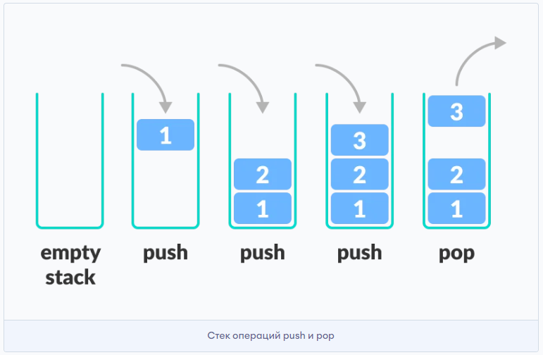 В терминах программирования размещение элемента на вершине стека называется push, а удаление элемента — pop.