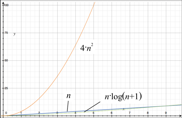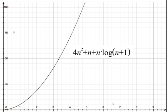 Оранжевый график соответствует формуле 4*n^2, синий – n, а зеленый – n*log(n+1). Похоже, мы можем упростить формулу до 4*n^2 без радикального изменения формы графика.