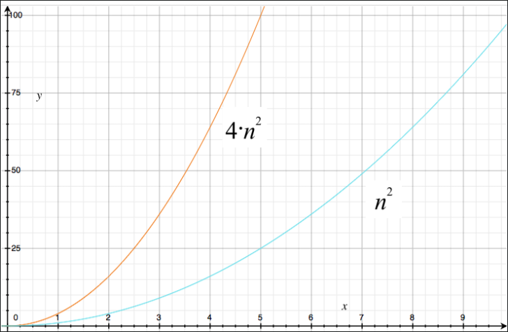 Таким образом, для того, чтобы провести оценку, мы можем даже исключить константный фактор роста. Наша формула теперь сократилась до простого n^2, а ее форма все еще напоминает исходную кривую в полной формуле.