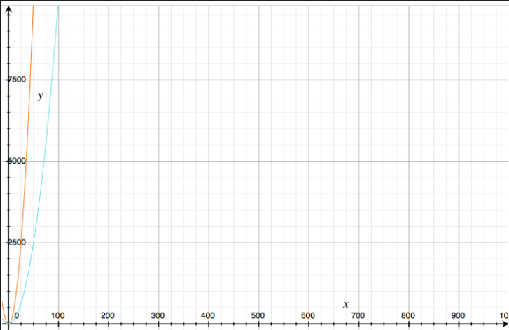 Новая кривая (голубая) выглядит менее крутой, чем исходная. Однако их формы очень похожи, как и их поведение при увеличении размера ввода. Кривые сначала растут медленно, затем быстрее и, наконец, устремляются к бесконечности, как мы видим на этом изображении, где обе оси масштабированы в 100 раз: