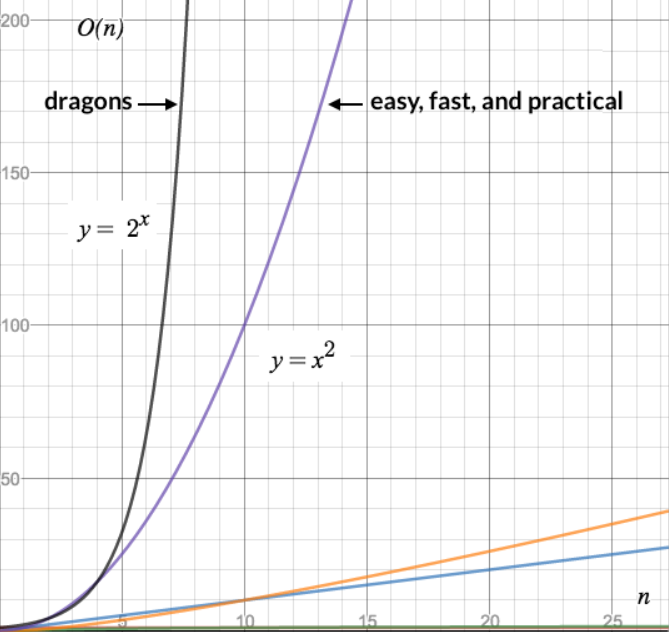 Теперь даже плоская синяя кривая пересекает черную! Попробуй это дома с еще меньшими значениями — при некоторых n экспоненциальная кривая пересечет полиномиальную и будет расти намного быстрее, чем полиномиальная кривая. Разница между полиномиальной и экспоненциальной действительно фундаментальна. Это относится к любой паре классов сложности.