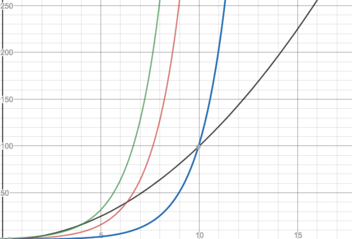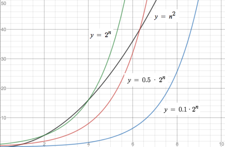 Черная линия — полиномиальная функция n^2, зеленая линия — экспоненциальная функция 2^n, а красная и синяя — экспоненциальные функции, умноженные на коэффициент 0,5 и 0,1 соответственно. Синяя выглядит намного лучше, чем полиномиальная кривая. Так может ли O(2^n) победить O(n^2) только линейным ускорением?