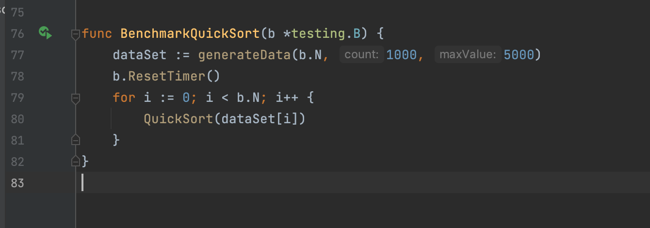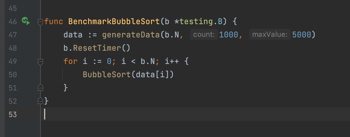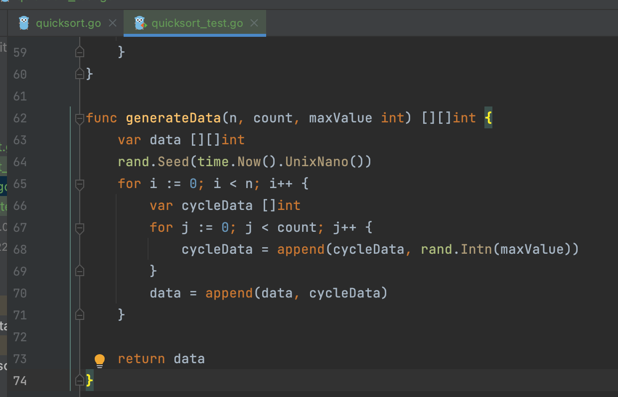 Функция выше генерирует многомерный массив (слайс слайсов) целочисленных чисел. Для чего? Так как после сортировки данные в переданном слайсе будут отсортированы, мы будем передавать новый слайс неотсортированных данных для корректных результатов бенчмарка.