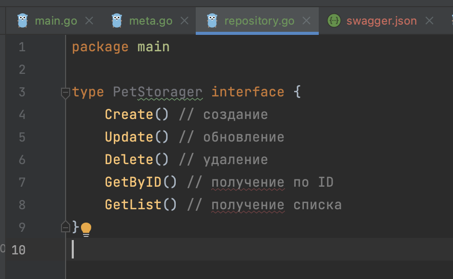 - Для начала в коде создадим PetStorage. Спроектируем интерфейс PetStorager: