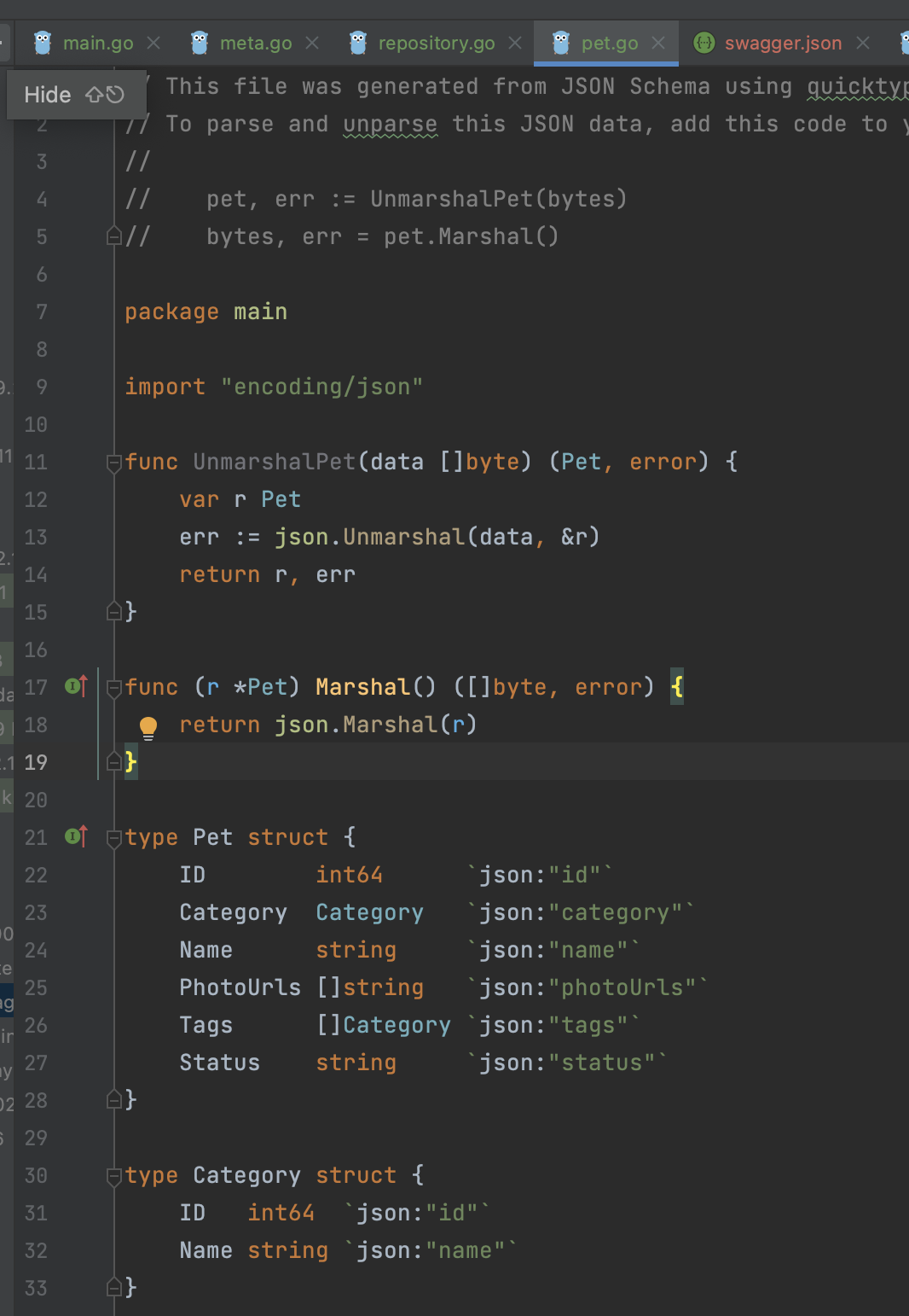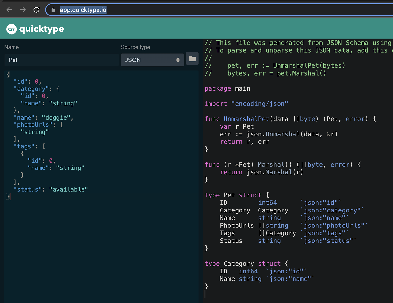 - Добавим сущность Pet в наш проект. Для этого скопируем ее из документации на сайте Quicktype: