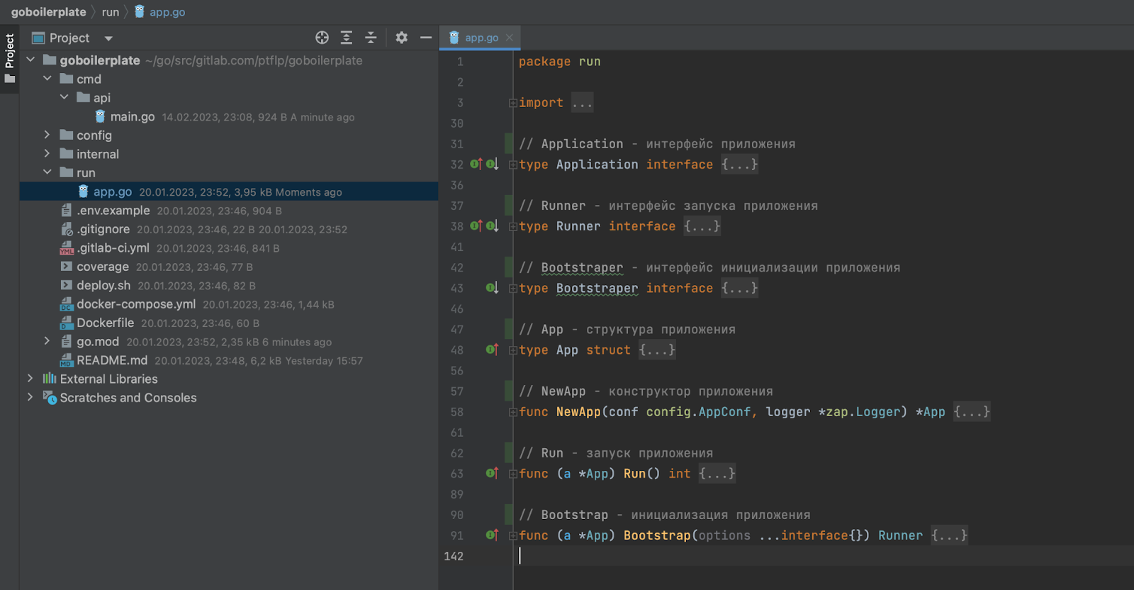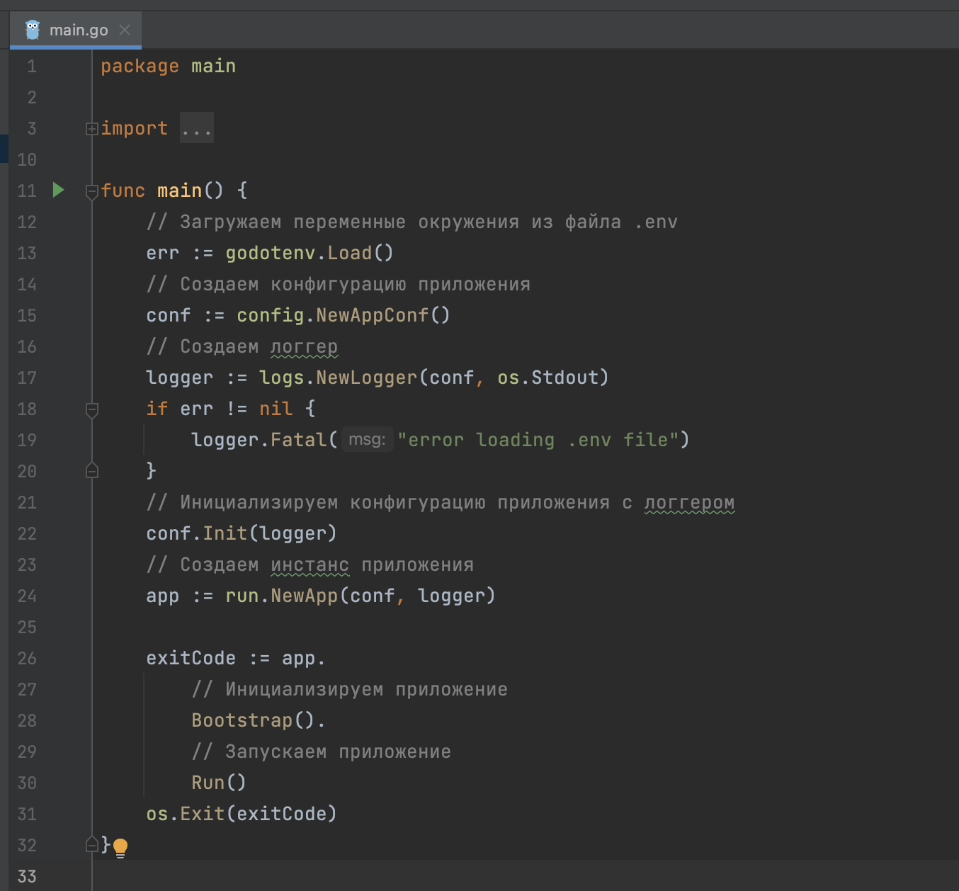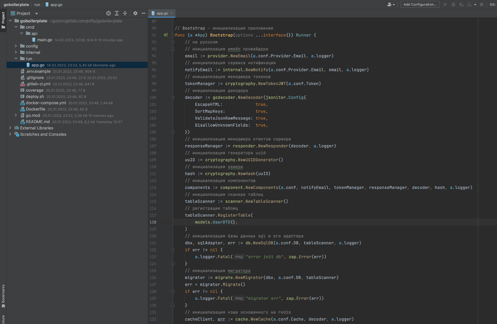 Самые важные действия здесь происходят в 28 и 30 строке. Давай рассмотрим их. Пройдем в функцию Bootstrap() с помощью ctrl/cmd + ЛКМ. Таким образом мы перейдем к файлу run/app.go.