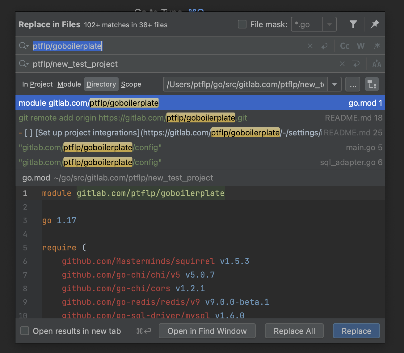 Сделай глобальную замену всех путей в проекте с ptflp/goboilerplate на username/your_project, где username — это твой username в gitlab.