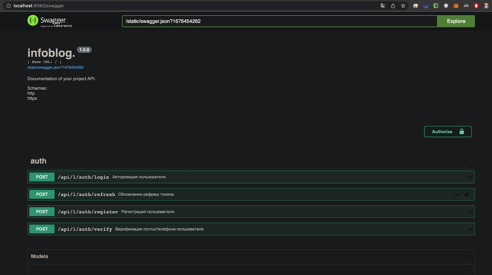 - Проверь работу веб-сервера, открыв веб-браузер и перейдя на адрес localhost:ваш_порт/swagger, который мы указали в .env файле (в представленном случае по умолчанию 8080). Если все настроено правильно, ты увидишь веб-страницу Swagger.